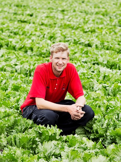 Här odlar han en mängd olika sallater allt beroende på växtföljd.